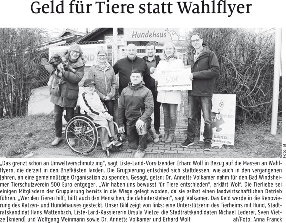 2020 Spende für das Tierheim Bad Windsheim (siehe Pressebericht rechts)