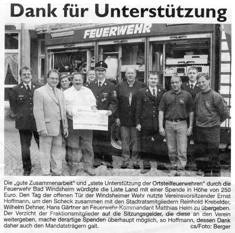 2004 Spende an die Feuerwehr Bad Windsheim (siehe Pressebericht rechts)