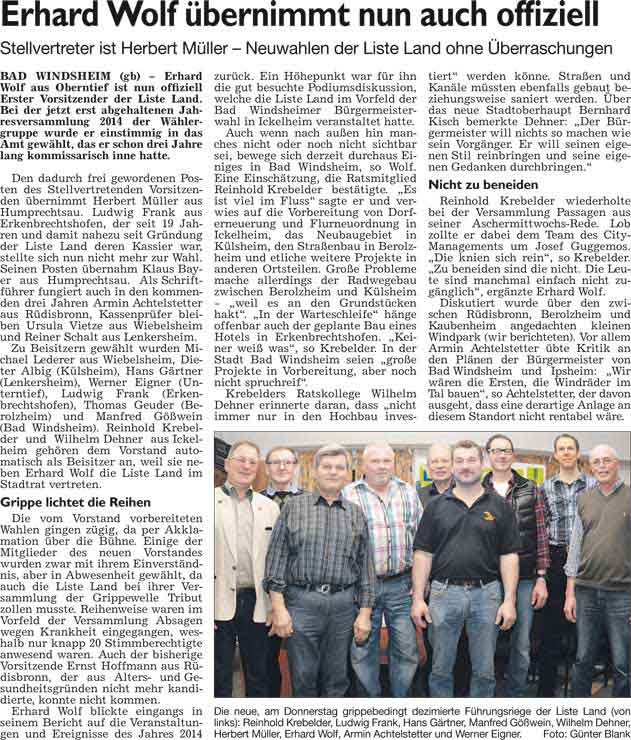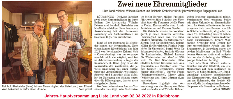 Im Zuge dieser Versammlung wurde Ernst Hoffmann † für seine jahrelangen Verdienste als Vorsitzender der Liste Land zum Ehrenvorsitzenden ernannt. (siehe Pressebericht und Bild rechts oben)