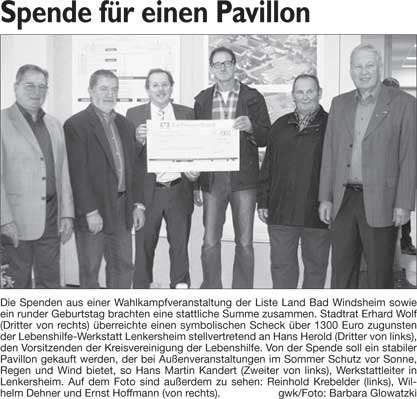 2014 Spende an die Lebenshilfe Lenkersheim (siehe Pressebericht rechts)