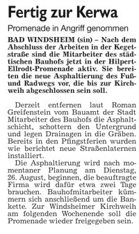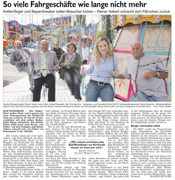 WZ 09. 8. 2014 "Neuer Asphalt statt mehr Flicken","Traumhaft schöner Start in das Festival", "Frisches, junges Franken", "Fertig zur Kerwa"
