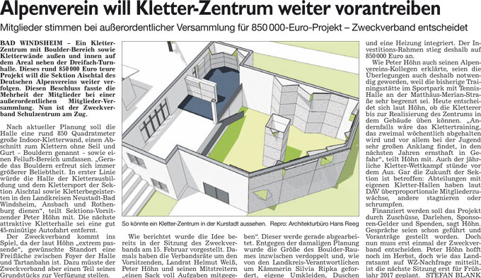 WZ 10. 8. 2016 "Alpenverein will Kletter-Zentrum weiter vorantreiben"