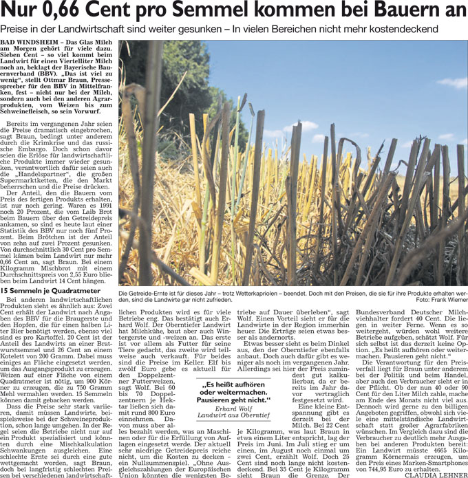 WZ 23. 8. 2016 "Nur 0,66 Cent pro Semmel kommen bei Bauern an"