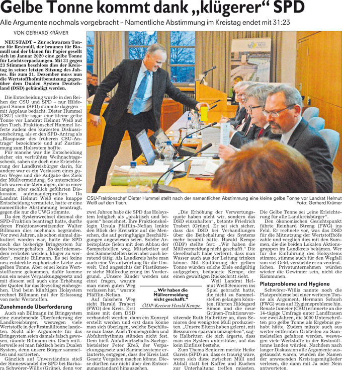 WZ 18. 12. 2017 "Gelbe Tonne kommt dank "klügerer" SPD"