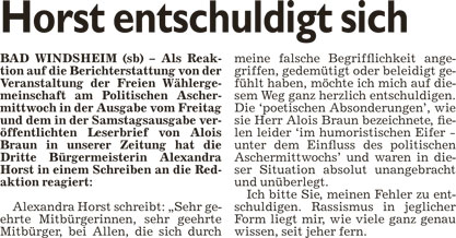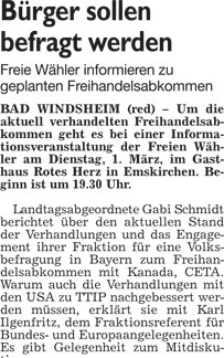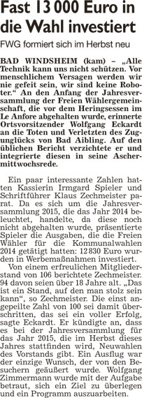 WZ 12. 2. 2016 "Investoren nicht die Tür verschschließen", "FWG storniert Aldis Traumreise", "Fast 13000 Euro in die Wahl investiert", "Emotionen nur bei den Ortsteilen", "Herz und Hirn statt Hass und Hetze", "Statiker untersucht den Weinturm"