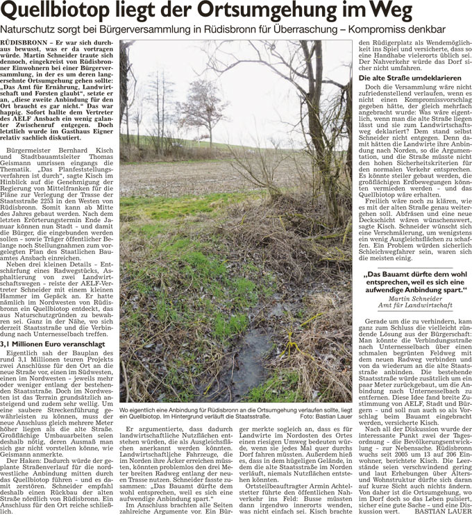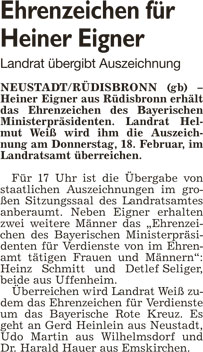 WZ 13./14. 2. 2016 "Ehrenzeichen für Heiner Eigner", "Quellbiotop liegt der Ortsumgehung im Weg"