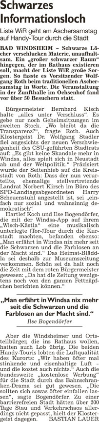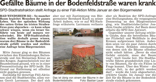 WZ 15. 2. 2016 "Schwarzes Informationsloch", "Gefällte Bäume in der Bodenfeldstraße waren krank", "Horst entschuldigt sich", "Geld für Bauwagen-Projekt", "Die Wächter der Steine geben sich die Ehre"