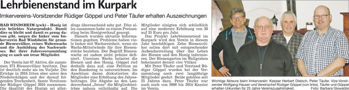 WZ 3. 2. 2017 "Ein halbes Jahrhundert Tenor und Bass", "Lehrbienenstand im Kurpark"