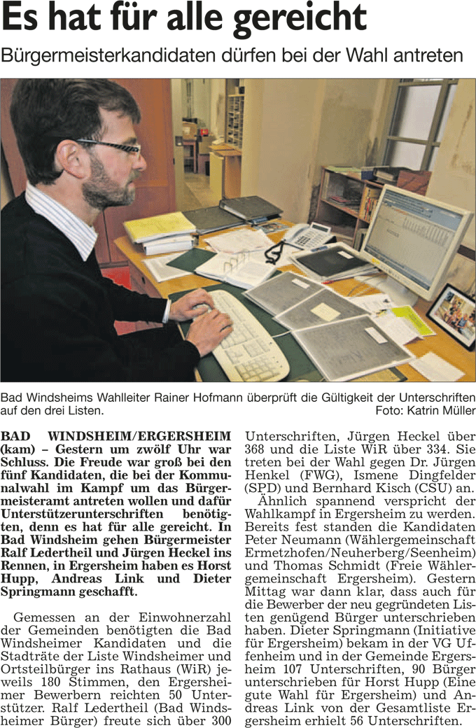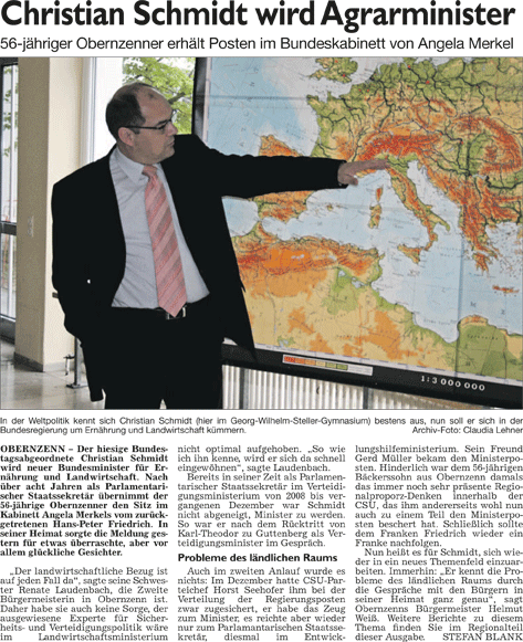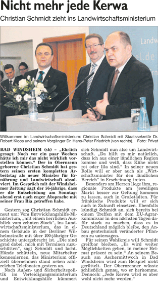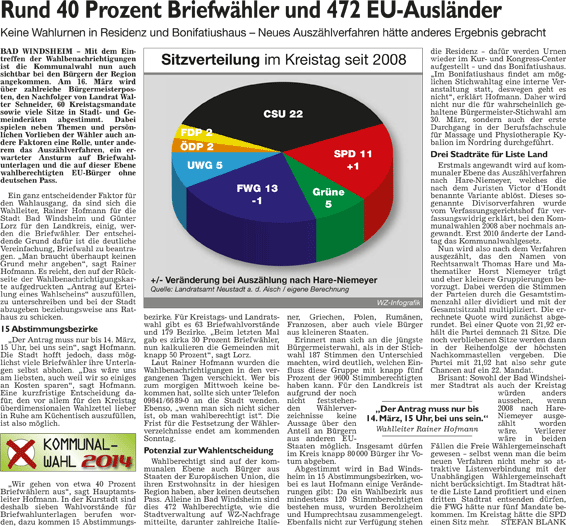 WZ 18. 2. 2014 "Christian Schmidt wird Agrarminister", "Rund 40% Briefwähler und 472 EU-Ausländer", "Förderung geringer", "Im Internet schon sehr präsent"