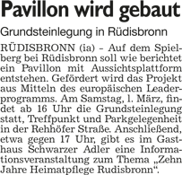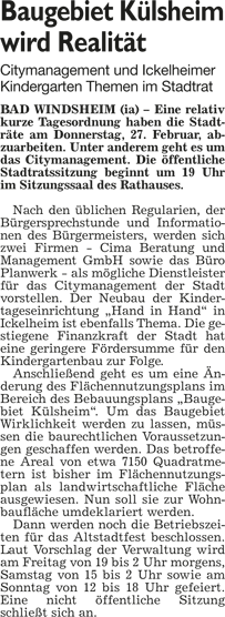 WZ 24. 2. 2014 "Baugebiet Külsheim wird Realität", "Gemeinsam die Kurstadt voranbringen", "Pavillon wird gebaut"
