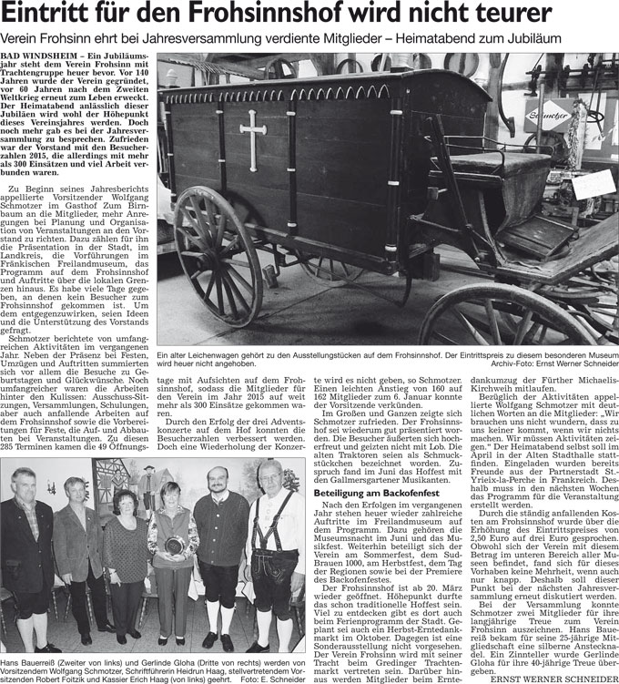 WZ 11. 1. 2016 "Eintritt für den Frohsinnhof wird nicht teurer", "Neues Domizil auf 22000 Quadratmetern Fläche", "Die nächste Pizza soll es im Herbst geben"