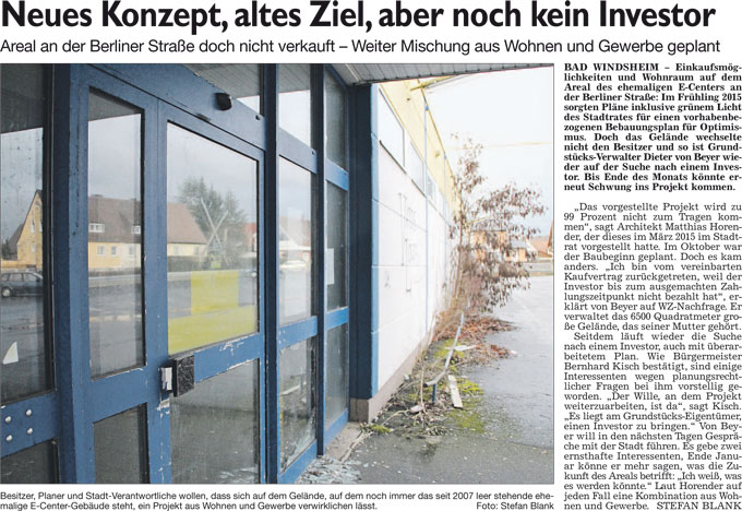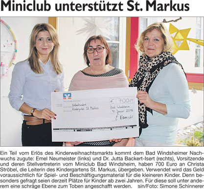 WZ 13. 1. 2016 "Neues Konzept, altes Ziel, aber noch kein Investor", "Mit Tatkraft überzeugt", "Miniclub unterstützt St. Markus"