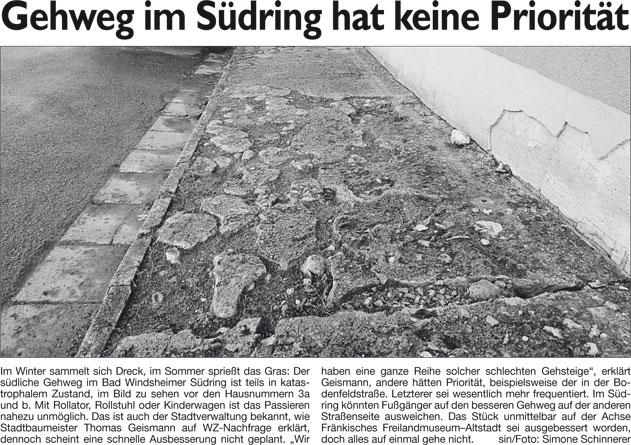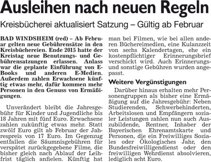 WZ 15. 1. 2016 "Gehweg im Südring hat keine Priorität", "Ausleihen nach neuen Regeln", "Sänger zahlen künftig höheren Beitrag"