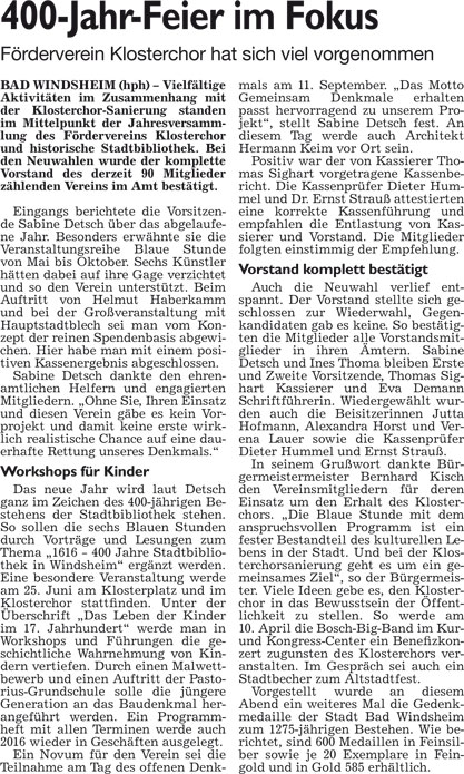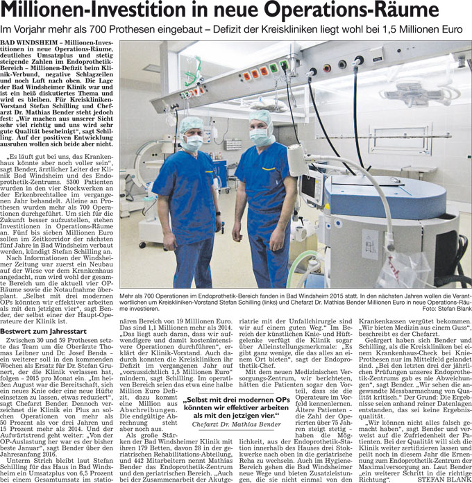 WZ 29. 1. 2016 "400-Jahr-Feier im Fokus", "Millionen-Investition in neue Operations-Räume", "Bewährte Mannschaft und junge Kräfte"
