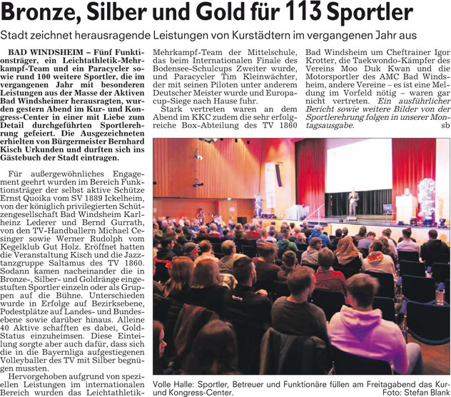 WZ 20./21. 1. 2018 "Bronze, Silber und Gold für 113 Sportler"