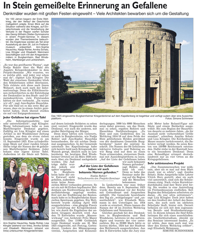 WZ 08. 7. 2014 "In Stein gemeißelte Erinnerungen an Gefallene","Gesundes Essen, das den Kindern auch schmeckt", "Als König Fußball den Kürzeren zog", "Feuer, Kampfkunst und viel Unterhaltung beim Altstadtfest"