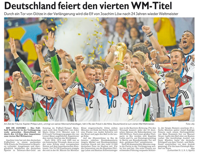 WZ 14. 7. 2014 "Deutschland feirt den vierten WM-Titel", "Ein Signal zu vielen bekannten Problemen", "Wegweiser für Senioren", "Erfolgreiche Sportler im Blitzlichtgewitter", "Zwei Schläge für das erste Bierfass"