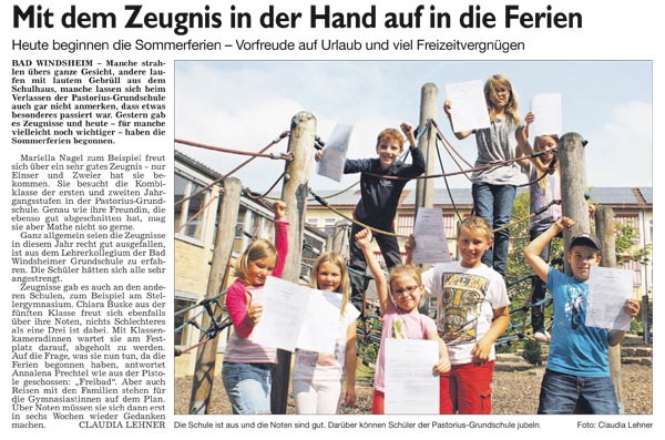 WZ 29. 7. 2014 "Förderverein macht viele Projekte möglich", "Bauausschuss bestätigt Farbauswahl für die Sporthalle", "Alltag der Menschen im Ersten Weltkrieg", "Mit dem Zeugnis in der Hand auf in die Ferien"
