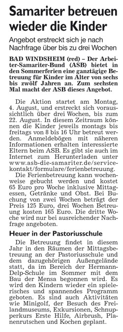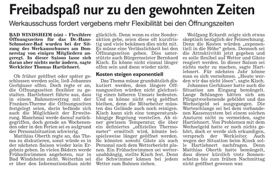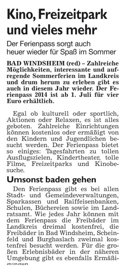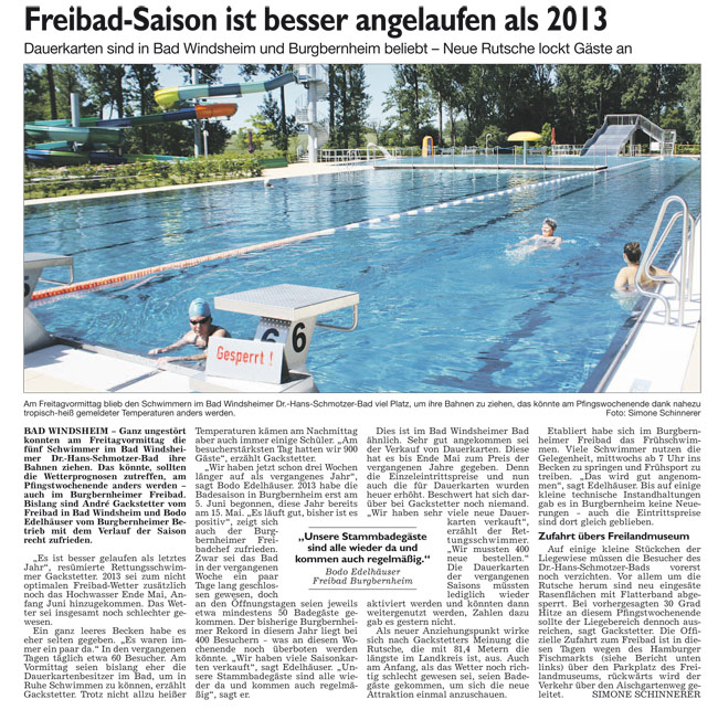 WZ 7. 6. 2014 "Freibad-Saison ist besser angelaufen als 2013","Gute Benehmen wird trainiert", "Wasserkraft mit ausgeklügelter Technik nutzen", "Wasserspaß am Stadtstrand"