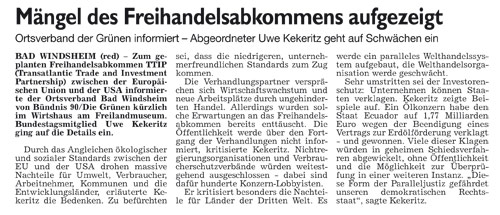 WZ 5. 6. 2014 "Kinder aus dem Schwedenwall ziehen bald um","Kunst unterm Kirchendach", "Mängel des Freihandelsabkommens aufgezeigt"