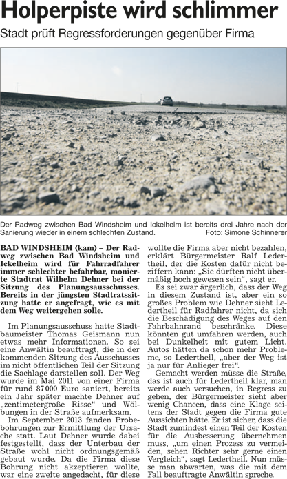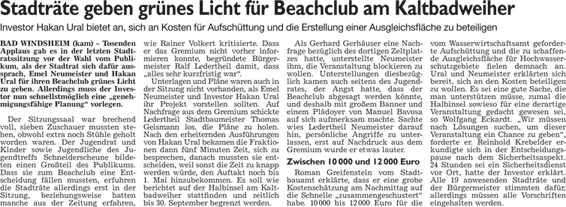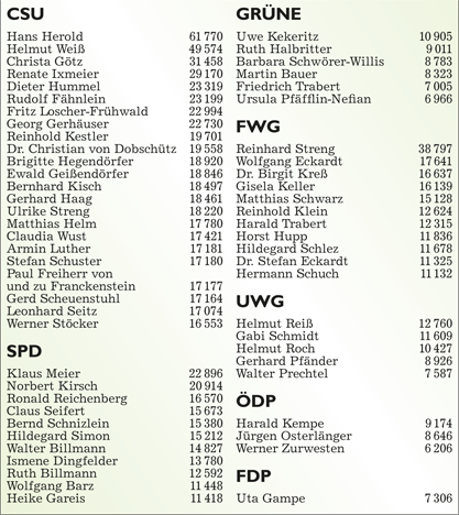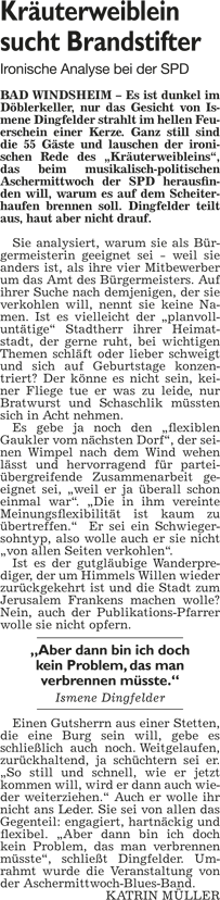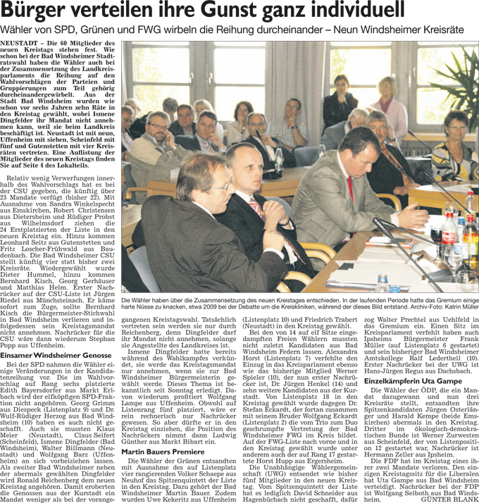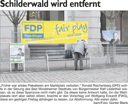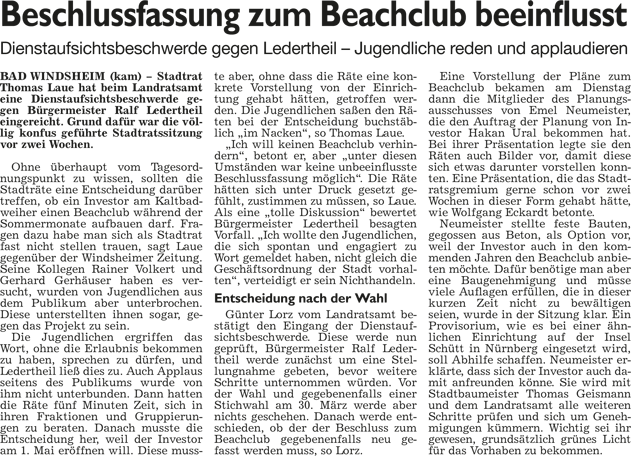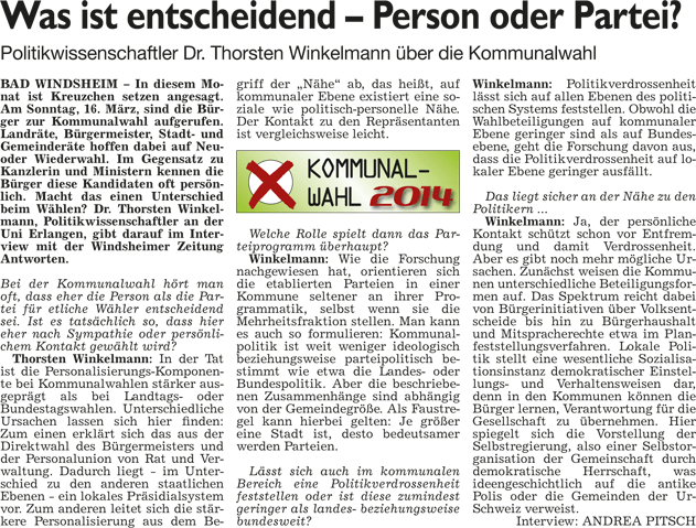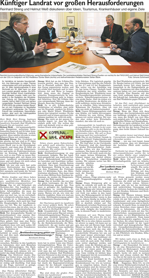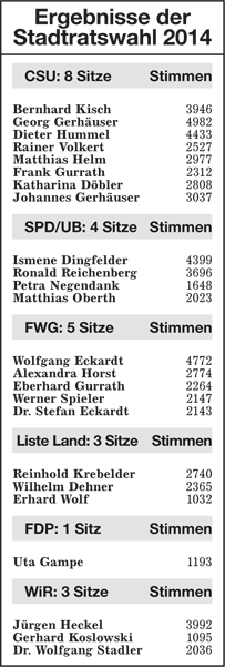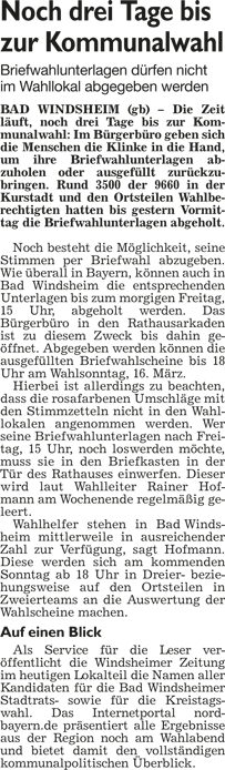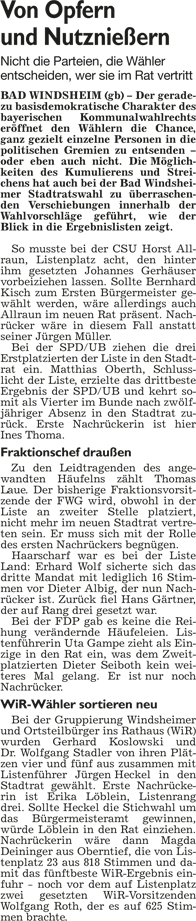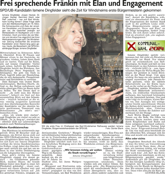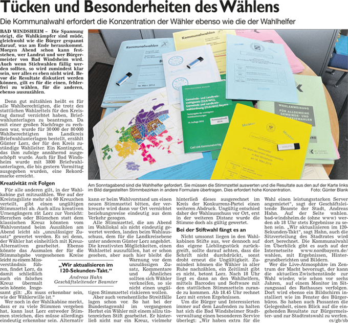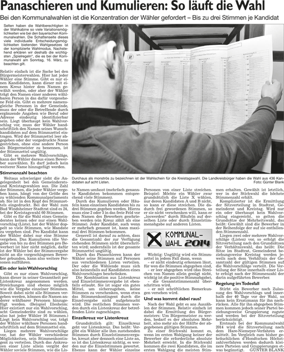 WZ 1./2. März 2014 "Panaschieren und Kumulieren:So läuft die Wahl", "Frei sprechende Fränkin mit Elan und Engagement", "Kompetenzen nicht überschritten", "Stadträte geben grünes Licht für Beachclub am Kaltbadweiher", "Schilderwald wird entfernt", "Flug der Drohne war genehmigt"