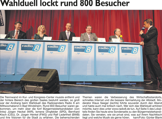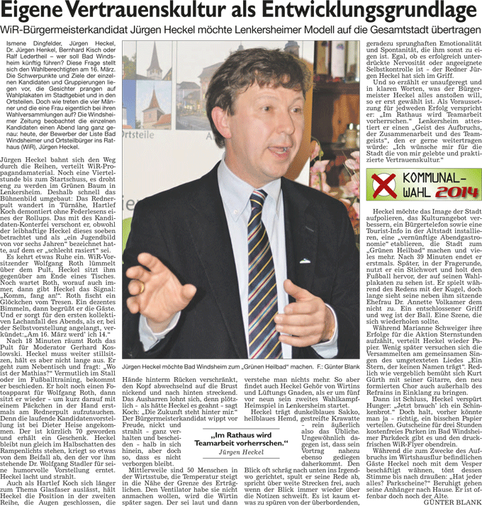 WZ 14. 3. 2014 "Wahlduell lockt rund 800 Besucher", "Bei Knoten und Stichen fast besser als die Männer", "Der Biber soll weichen"