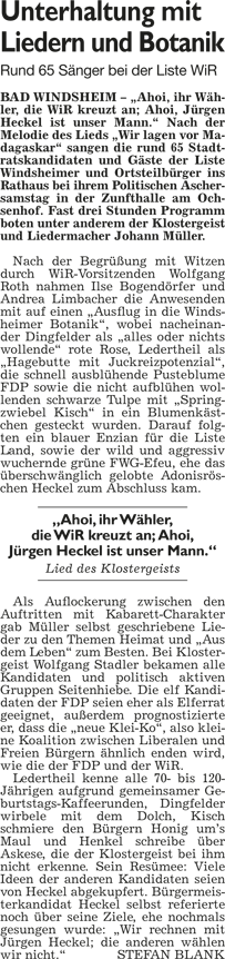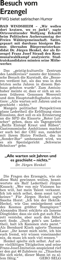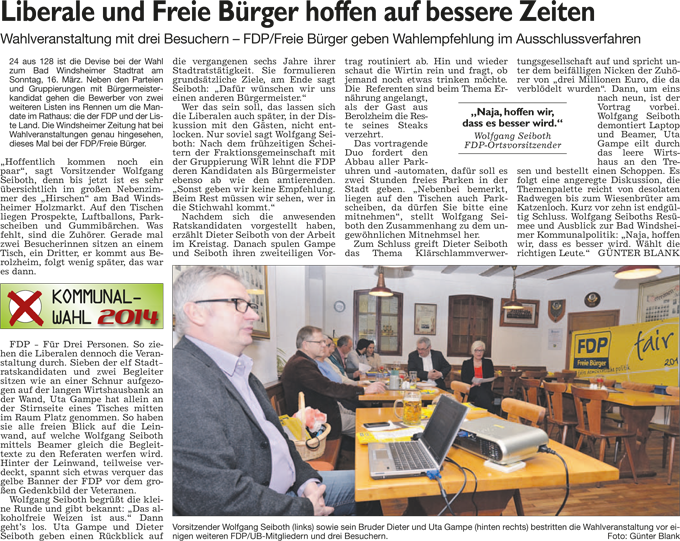 WZ 7. 3. 2014 "Geselligkeit statt böser Worte", "Verzicht auf derben Schlagabtausch", "Kräuterweiblein sucht Brandstifter"