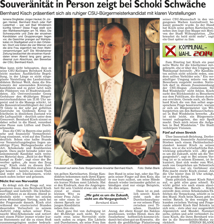WZ 10. 3. 2014 "Souveränität in Person zeigt bei Schoki Schwäche", "Liberale und Freie Bürger hoffen auf bessere Zeiten", "Ringen um Chefposten im Landratsamt(Beitrag über Ledertheil beachten)", "Zeichen setzen am ehemaligen Globus-Markt", "Unterhaltung mit Liedern und Botanik", "Besuch von Erzengel", "Besucher stürmen den Technikmarkt"