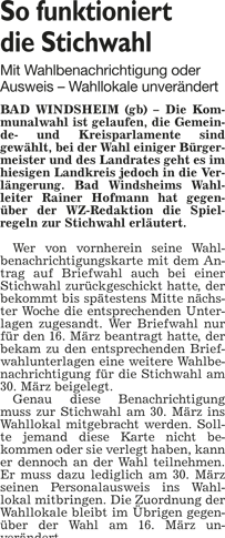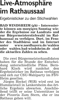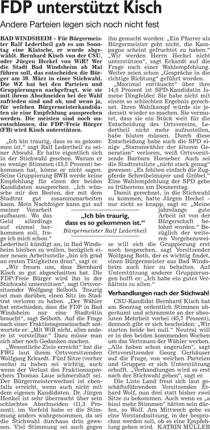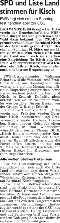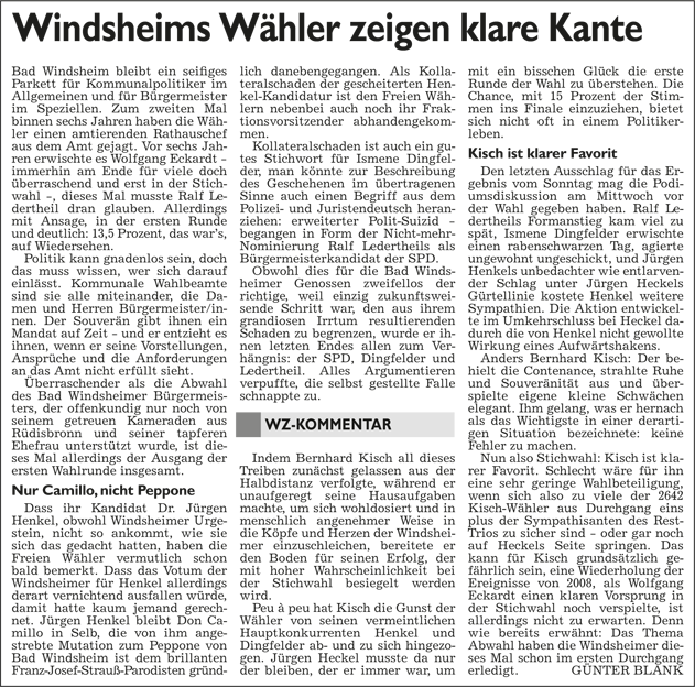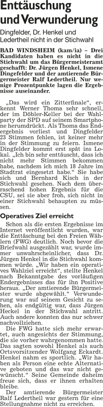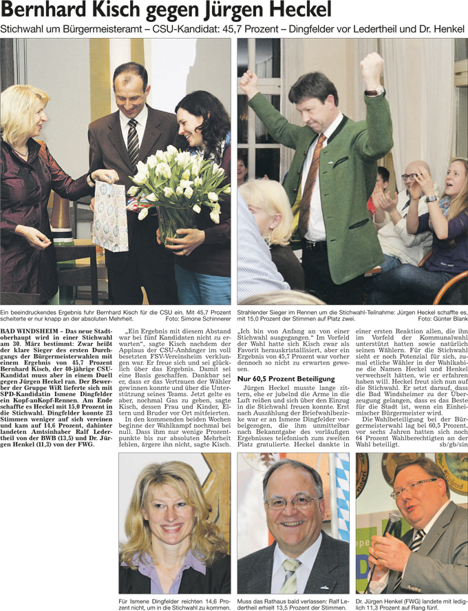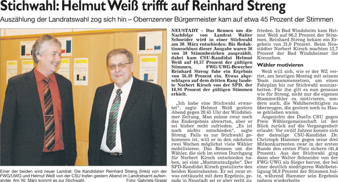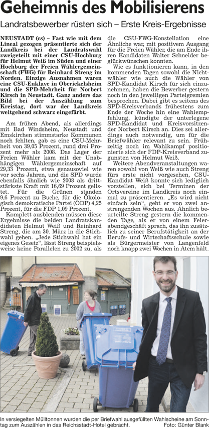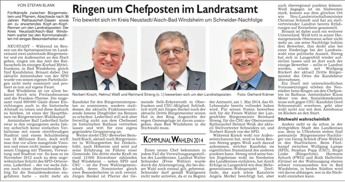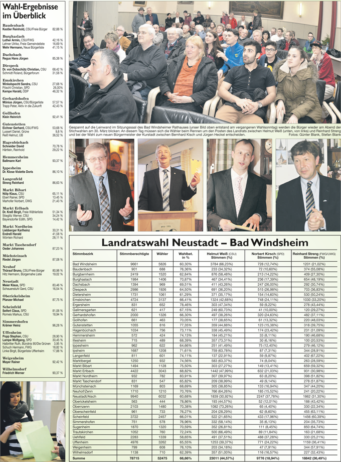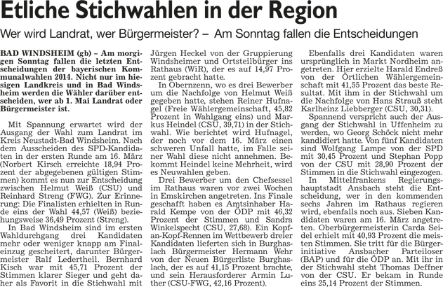 WZ 17. 3. 2014 "Bernhard Kisch gegen Jürgen Heckel", "Stichwahl:Helmut Weiß trifft auf Reinhard Streng", "Enttäuschung und Verwunderung", "Wahl-Ergebnisse im Überblick"
