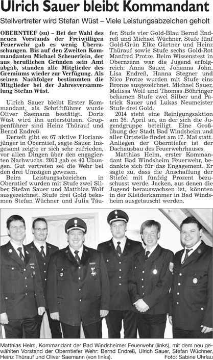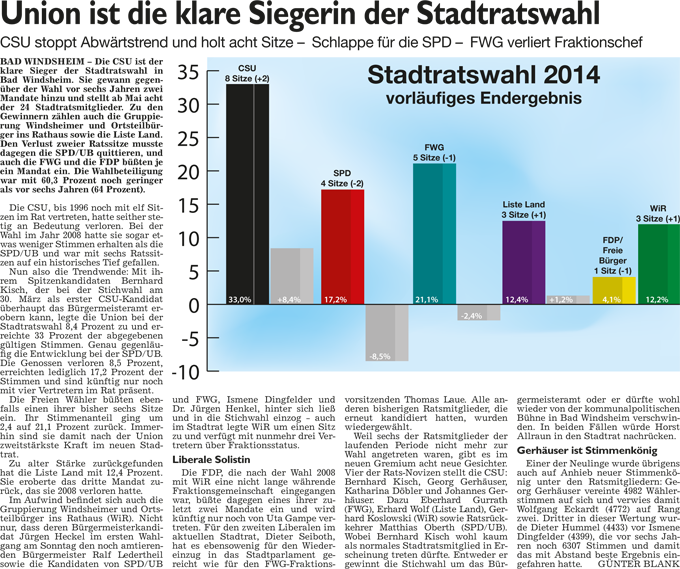 WZ 18. 3. 2014 "Union ist die klare Siegerin der Stadtratswahl", "Ergebnisse der Stadtratswahl 2014", "Von Opfern zu Nutznießern", "FDP unterstützt Kisch", " Geheimnis des Mobilisierens", "Ulrich Sauer bleibt Kommandant"