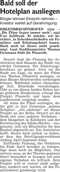 WZ 26. 3. 2014 "Bald soll der Hotelplan ausliegen", "Klinik ist zukunftsfähig", "Windkraftprojekt auf Eis"