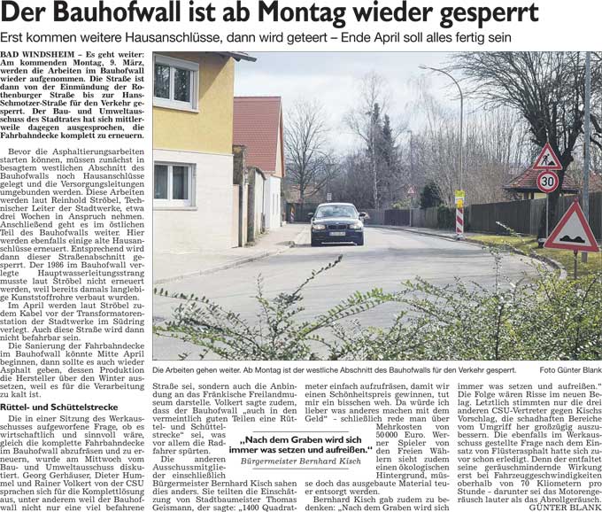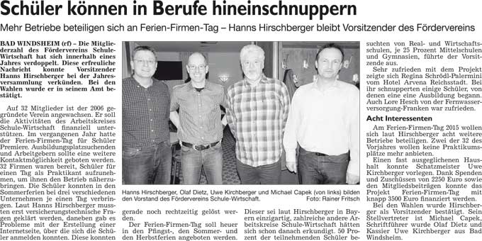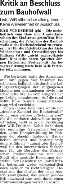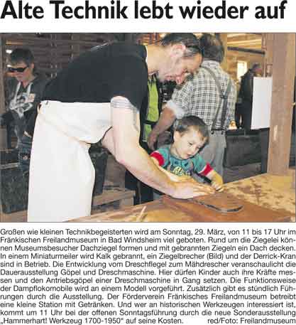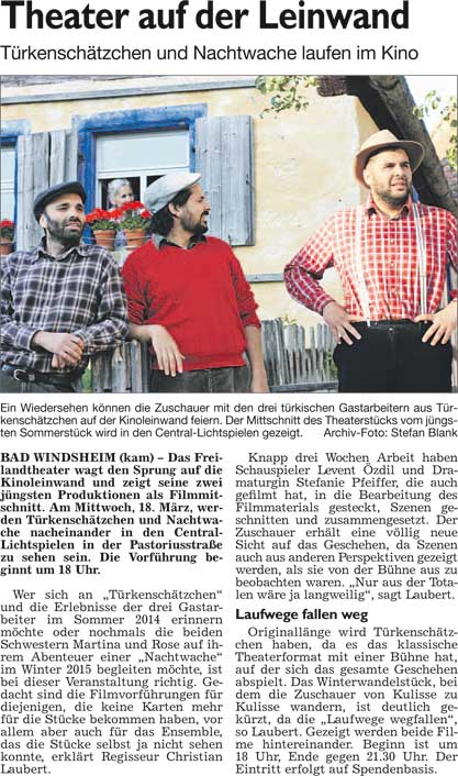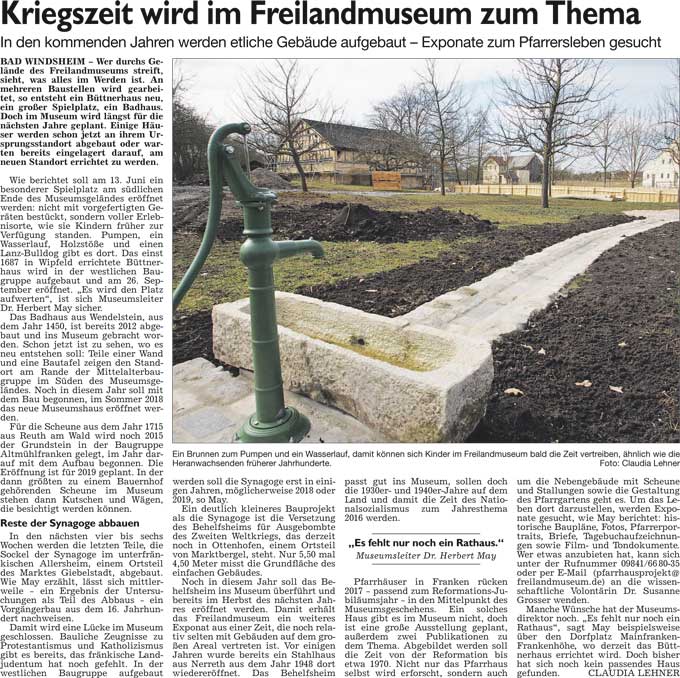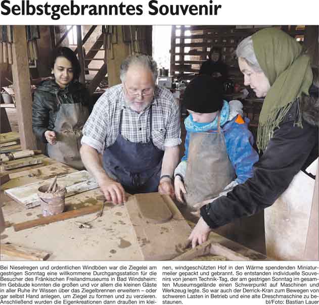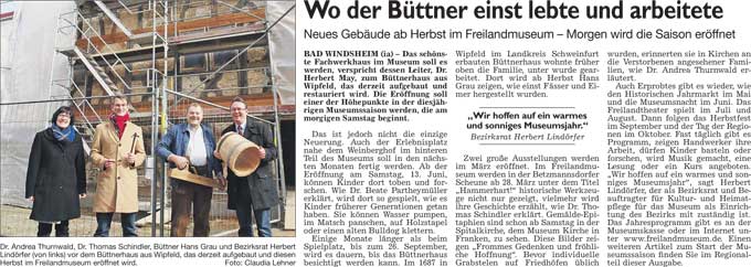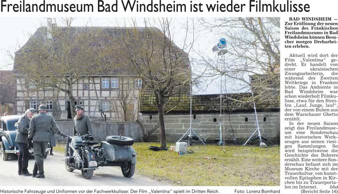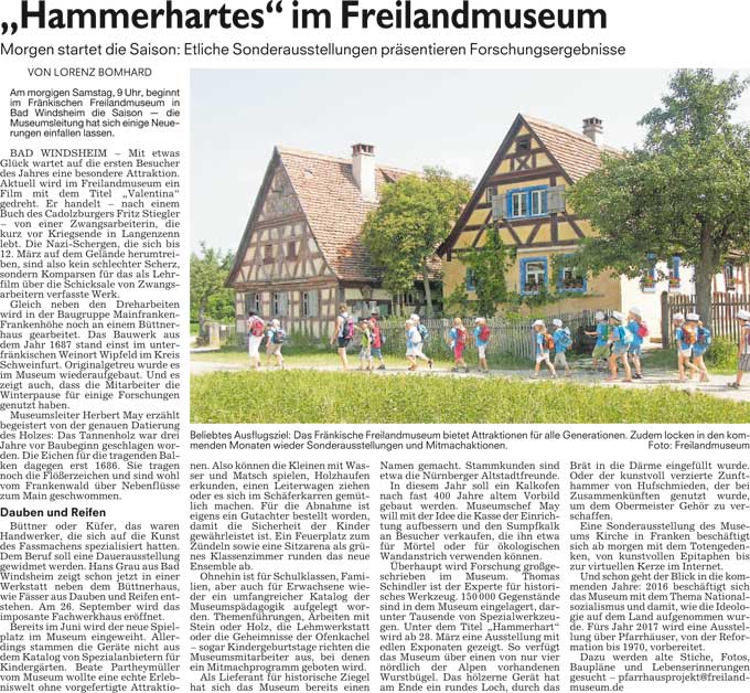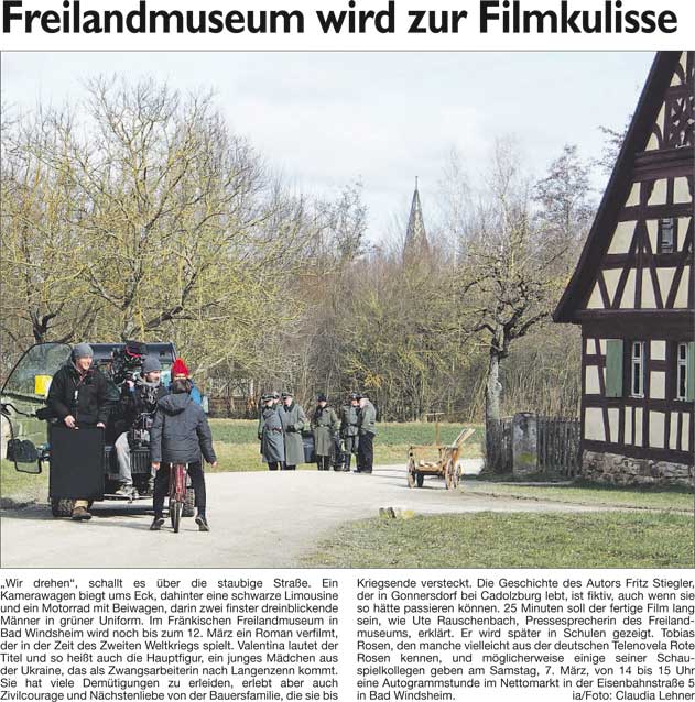 WZ 6. 3. 2015 "Der Bauhofwall ist ab Montag wieder gesperrt", "Wo der Büttner einst lebte und arbeitete", "Freilandmuseum Bad Windsheim ist wieder Filmkulisse", "Freilandmuseum wird zur Filmkulisse", "Wieder ein Schuljahr mehr?", "Ausbildung und Sicherheit im Fokus", "Gabi Schmidt steht hinter der Petition", "Hammerhartes" im Freilandmuseum", "Wiebelsheimer Segelflugzeuge sind bereit zum Abheben"