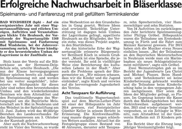 WZ 31. 3. 2015 "Regierung geht von weiterem Bedarf aus", "Helmut Scheuerlein zum Ehrenkommandanten ernannt", "Ludwig Müller gibt Vorsitz nach 33 Jahren ab", "Ab morgen regieren Angebot und Nachfrage", "Kreis-SPD fordert Reform bei Hartz IV", "Erfolgreiche Nachwuchsarbeit in der Bläserklasse"
