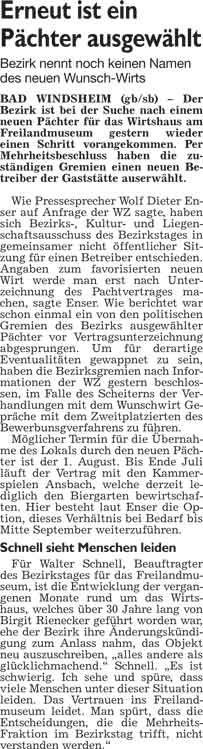 WZ 8. 8. 2015 "Stündlich ist der Absperrposten am Zug", "Freie Wähler verordnen sich Verjünungskur", "Erneut ist ein Pächter ausgewählt"