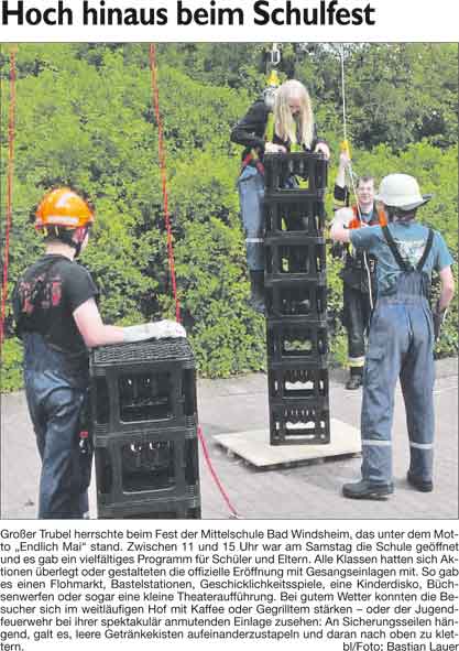 WZ 12. 5. 2015 "Schmuckes für Külsheim", "Das eigene Gleichgewicht testen", "Hoch hinaus beim Schulfest"