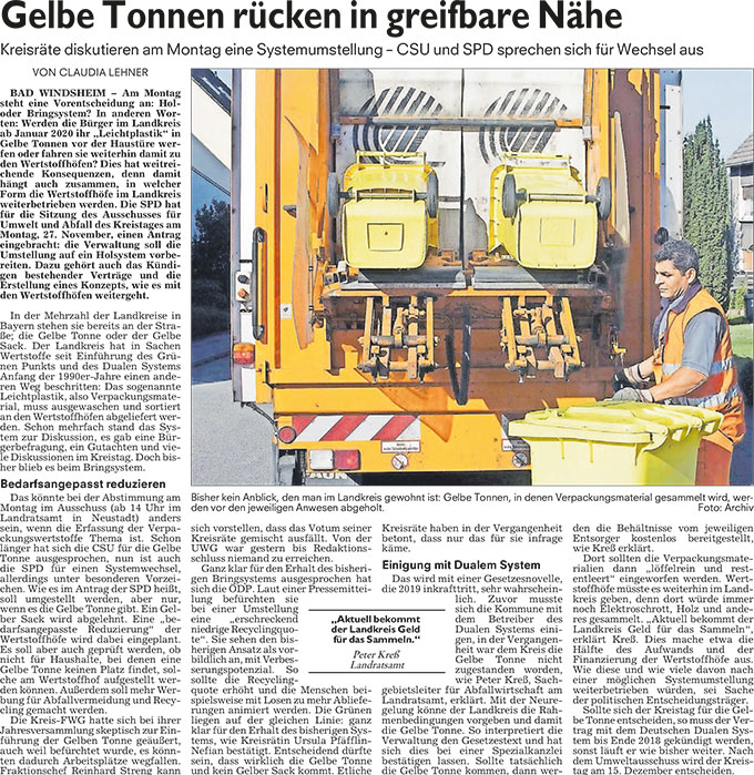 WZ 25./26. 11. 2017 "Gelbe Tonnen rücken in greifbare Nähe", "Straßenausbaubeiträge erhitzen die Gemüter"