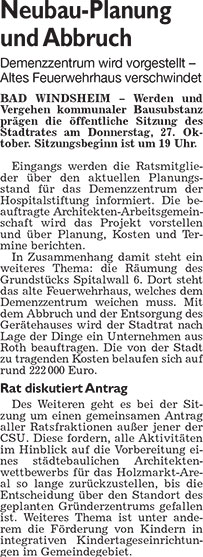 WZ 29./30. 10. 2016 "222351 Euro für das Feurwehrhaus", "Vertiefte Planung treibt Kosten in die Höhe"