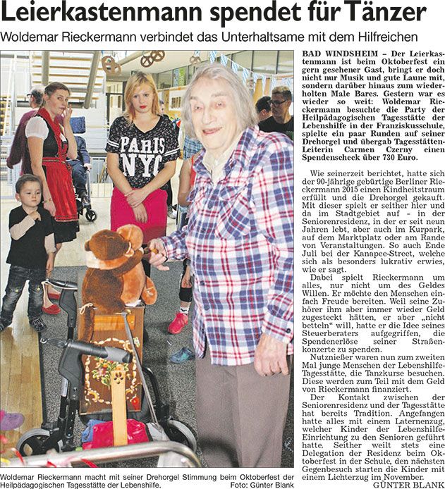 WZ 28. 10. 2016 "Ritterkampf und Höllenfeuer", "Leierkastenmann spendet für Tänzer"