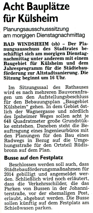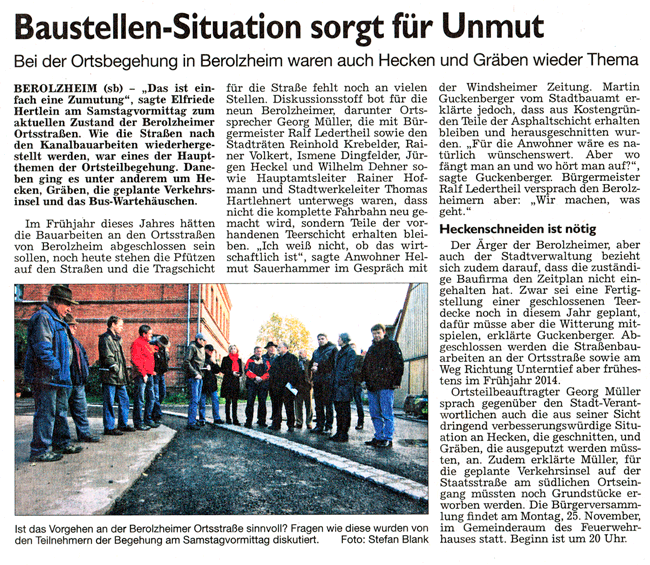 WZ 11.11. 2013 "Acht Bauplätze für Külsheim", "Heckel im Rennen", "Baustellensituation sorgt für Unmut"