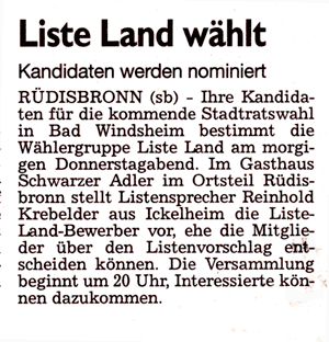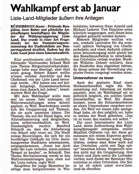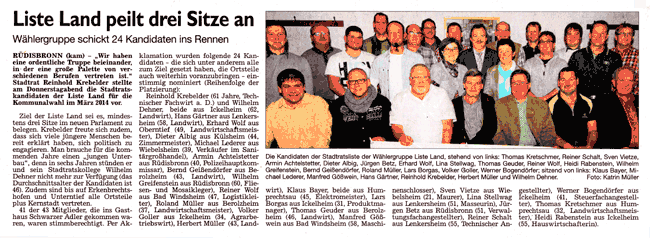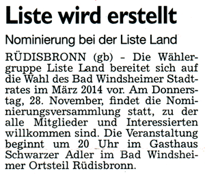 WZ 30.11/1.12. 2013 "Liste Land peilt drei Sitze an","Gemeinsam für die Stadt", "Vier plus Chef als Ziel", "Wahlkampf erst ab Januar", "Das Miteinander im BLick", "Die Möglichkeiten des Machbaren prüfen"