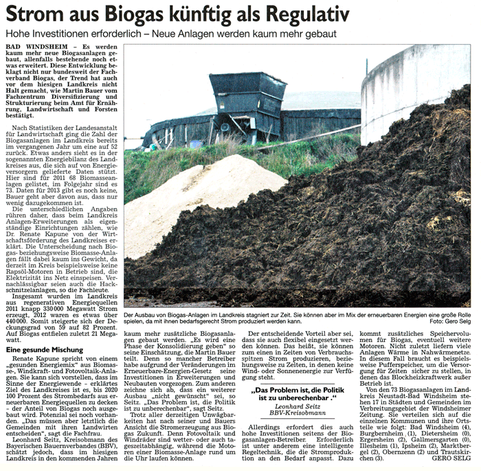 WZ 16/17.11. 2013 "Strom aus Biogas künftig als Regulativ","BWB ebnet Ledertheil den Weg"
