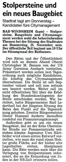 WZ 20.11. 2013 "Stolpersteine und ein neues Baugebiet"