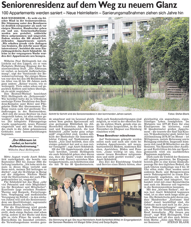 WZ 27. 9. 2014 "Gelebte Partnerschaft", "Nicht durch Humprechtsau", "Seniorenresidenz auf dem Weg zu neuem Glanz", "Nicht einverstanden mit weniger Geld"
